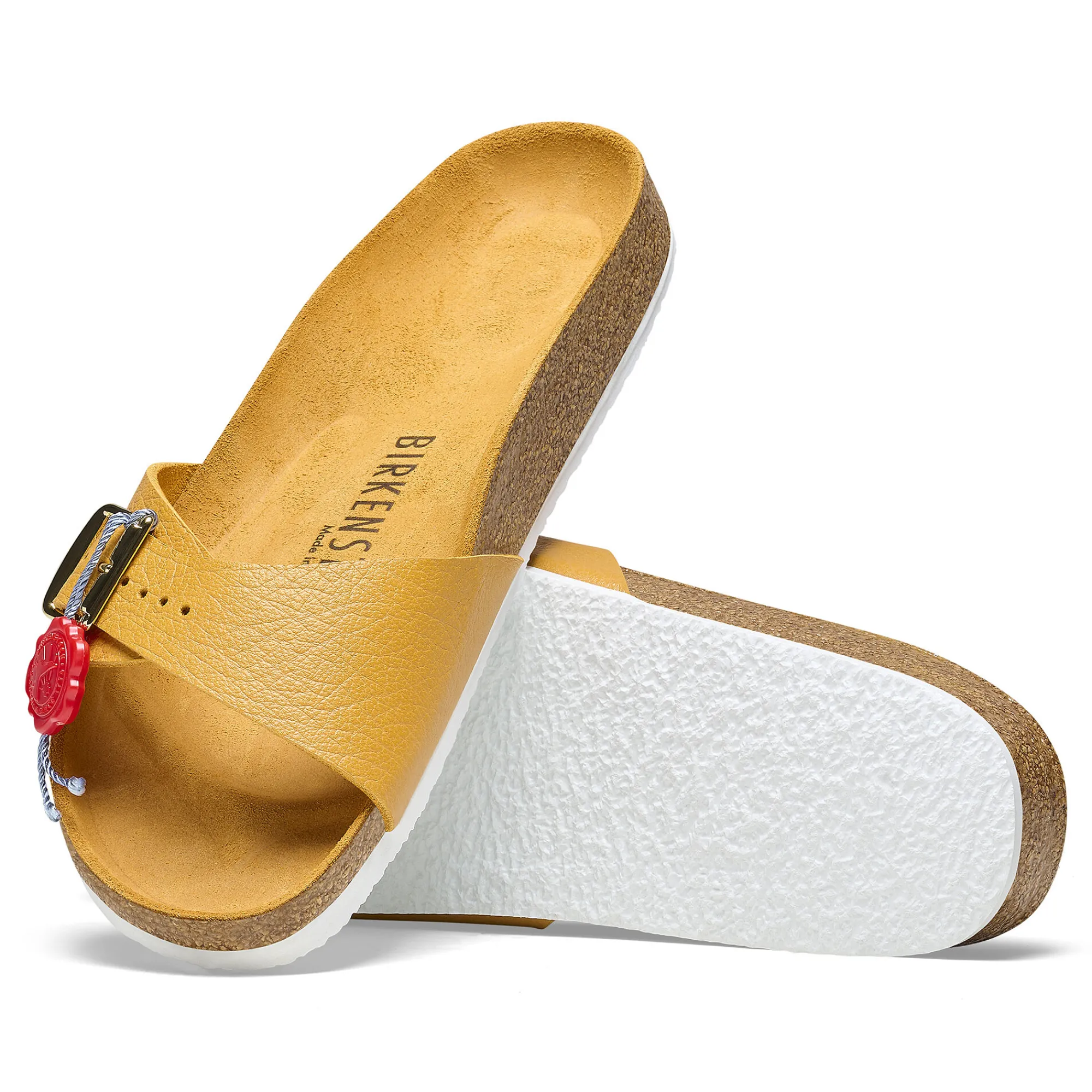 Der BIRKENSTOCK Madrid ist das älteste Mitglied der Modellfamilie und somit ein echter Klassiker. Vor einem halben Jahrhundert als „Gymnastik-Sandale“ lanciert, hat sich der puristische Einriemer längst zum modischen Begleiter entwickelt. Mit unserer Anniversary Kollektion lassen wir den beliebten Klassiker nun wieder in seinem ursprünglichen Design erstrahlen. Die Sandale gleicht mit ihren Schnallen, dem Fußbett, der Laufsohle und auch ihrer Verpackung dem Original von 1963 und versprüht echten Retro-Flair. Jedes Paar der limitierten Auflage mit begrenzter Stückzahl trägt sichtbar seine individuelle Nummer und wird mit dem roten BIRKENSTOCK Siegel sowie passenden Socken geliefert. Das Obermaterial besteht aus weichem, genarbtem Naturleder.
